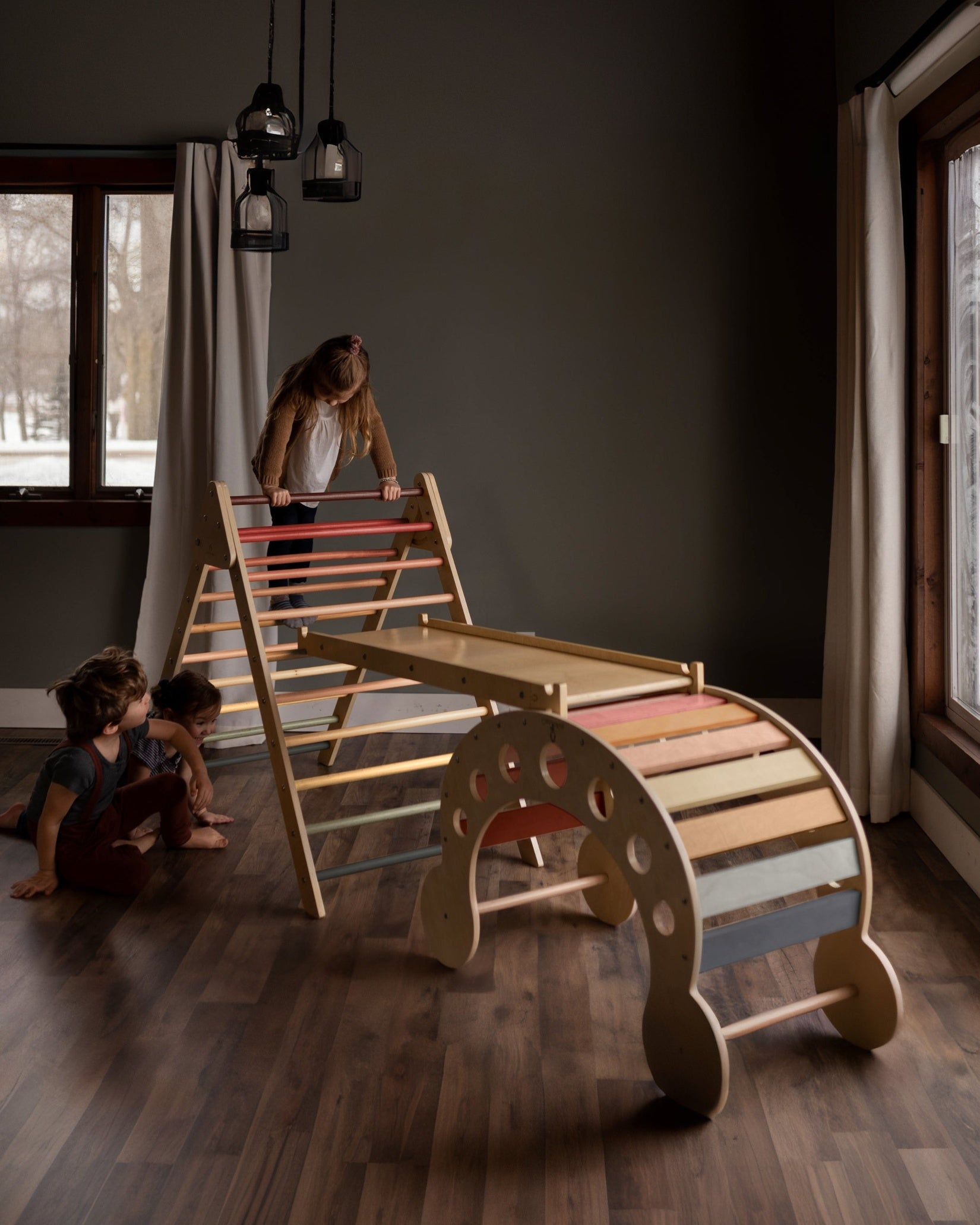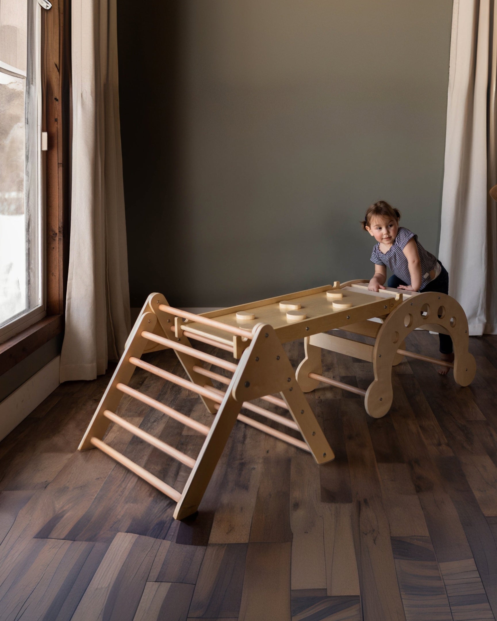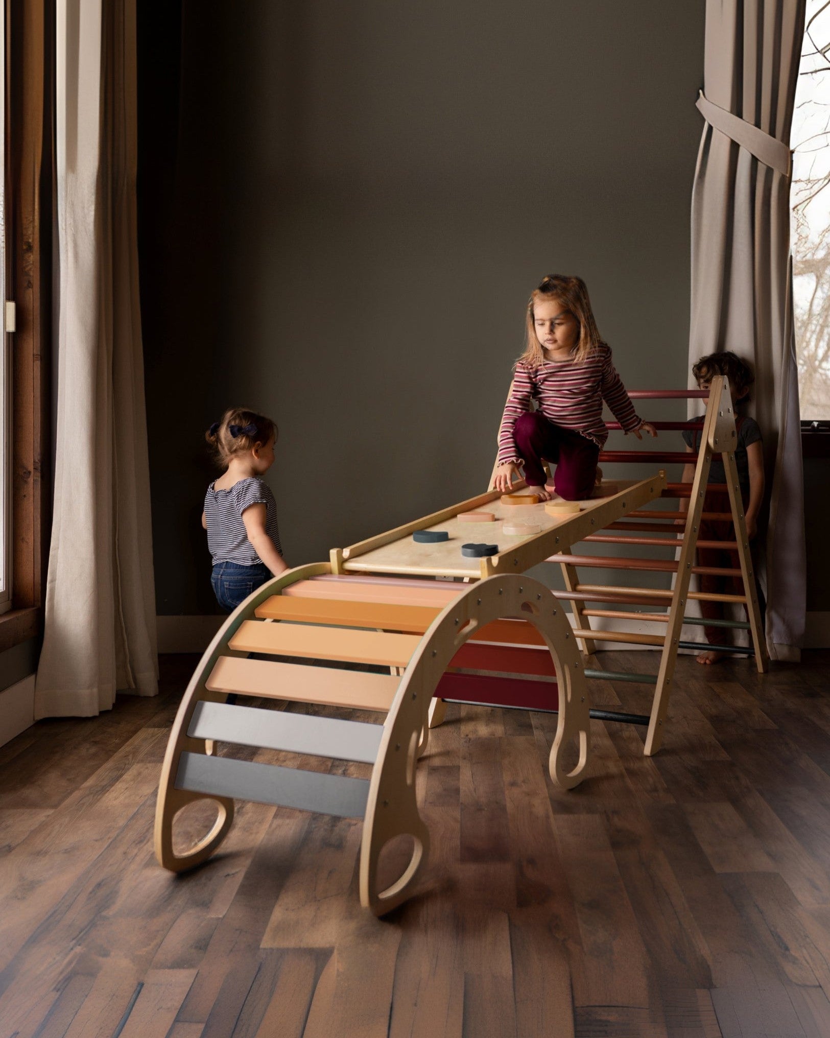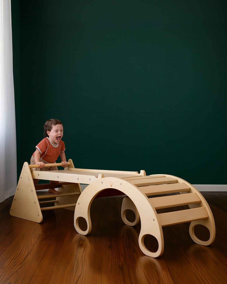 The Blue Ridge Waldorf Playset invites children to explore and develop gross motor skills, strength, and confidence through hands-on climbing experiences. Designed for children aged six months and older, it supports early milestones such as pulling up and grasping rungs, progressing to full climbs as strength and assurance build. With the addition of a blanket, this versatile playset transforms into a cozy tent or reading nook, offering a serene space for quiet moments and imaginative play.