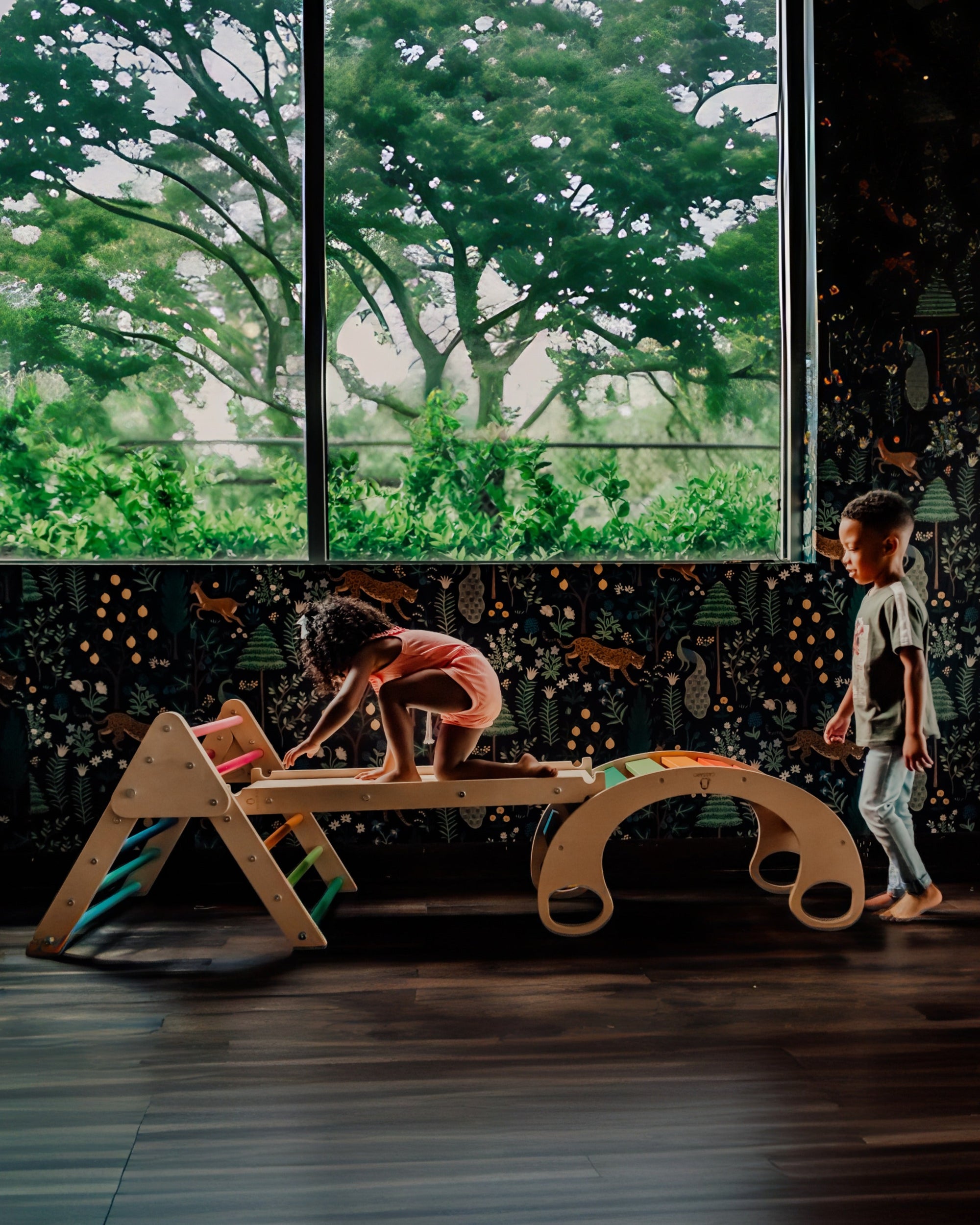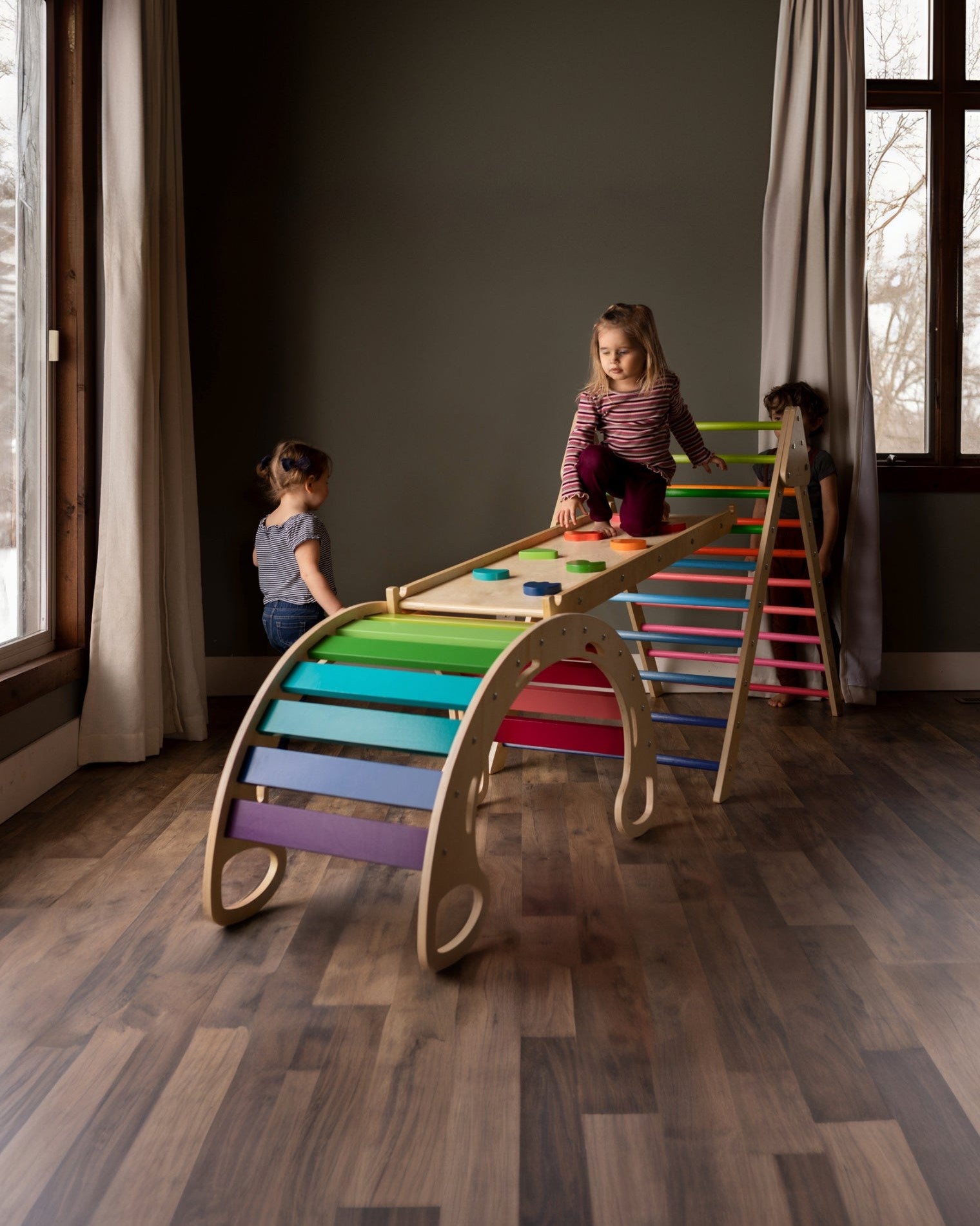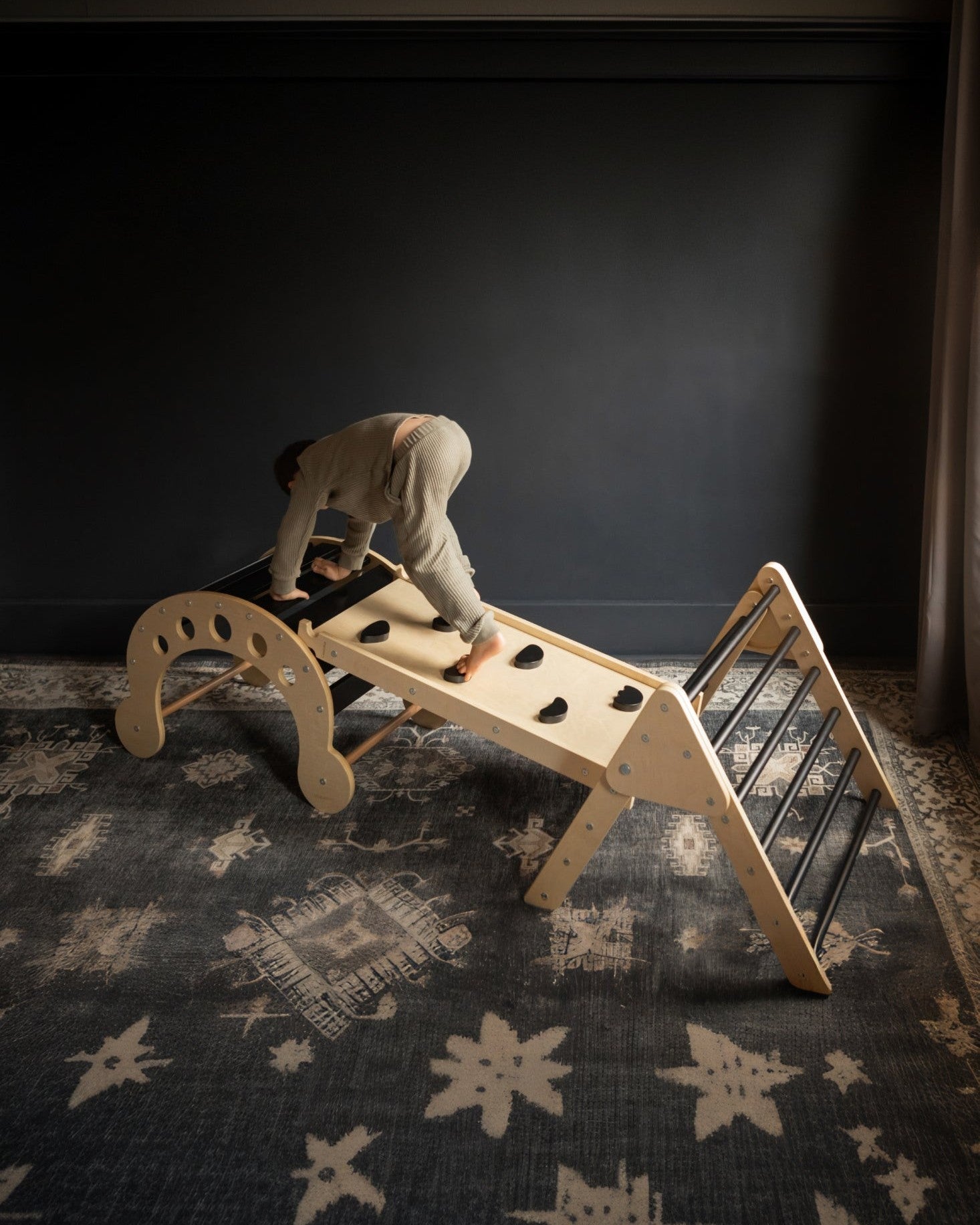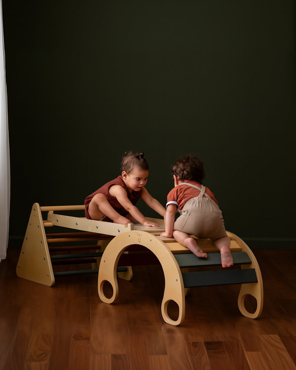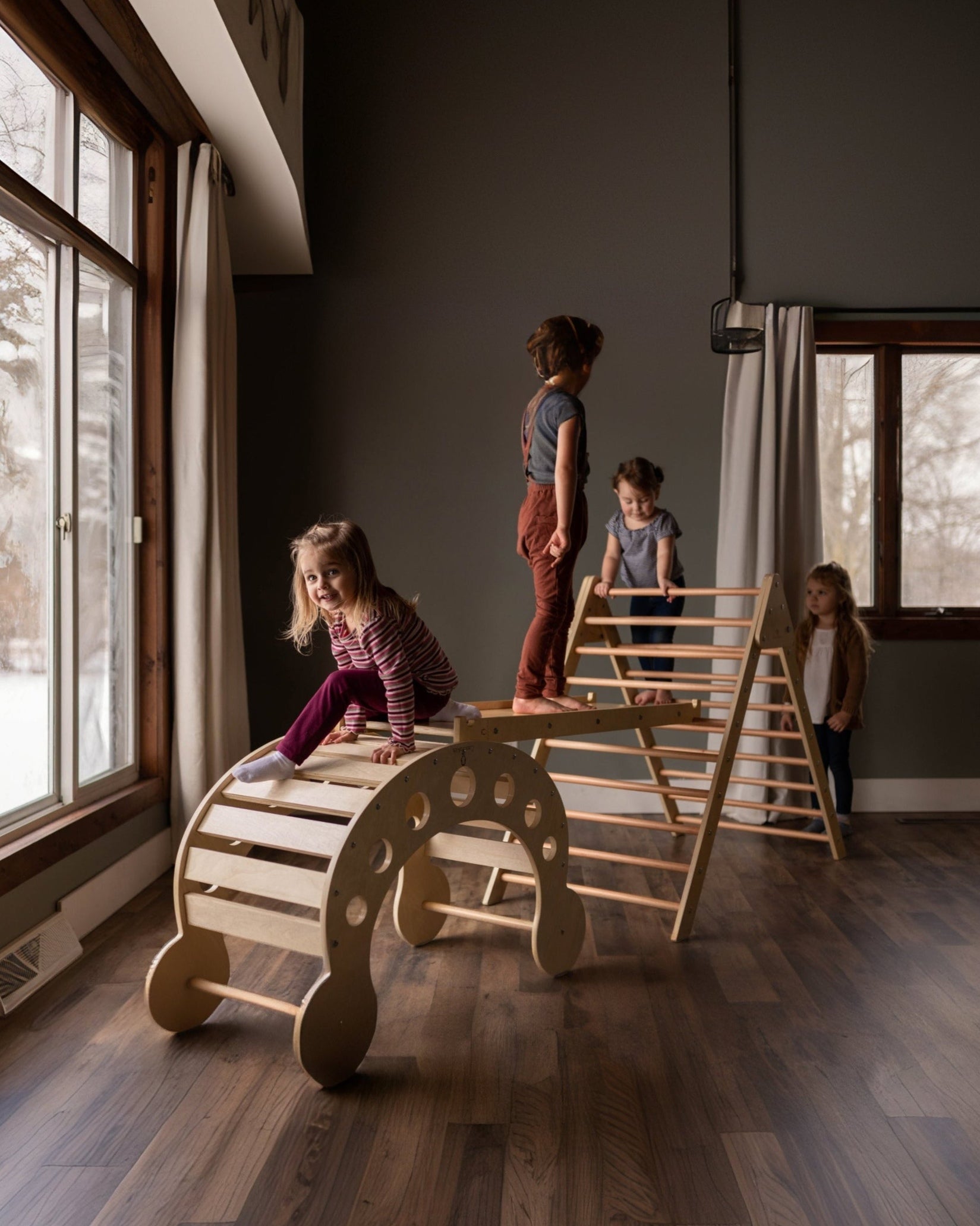 The Blue Ridge Waldorf Playset invites children to explore and develop gross motor skills, strength, and confidence through hands-on climbing experiences. Designed for children aged six months and older, it supports early milestones such as pulling up and grasping rungs, progressing to full climbs as strength and assurance build. With the addition of a blanket, this versatile playset transforms into a cozy tent or reading nook, offering a serene space for quiet moments and imaginative play.