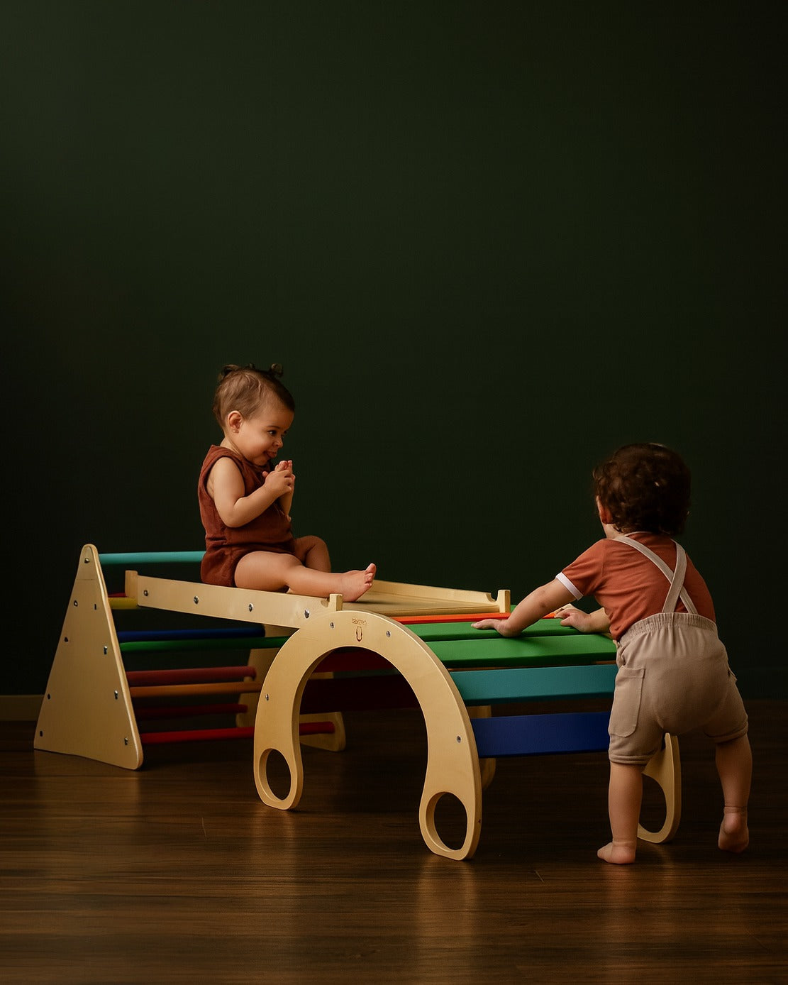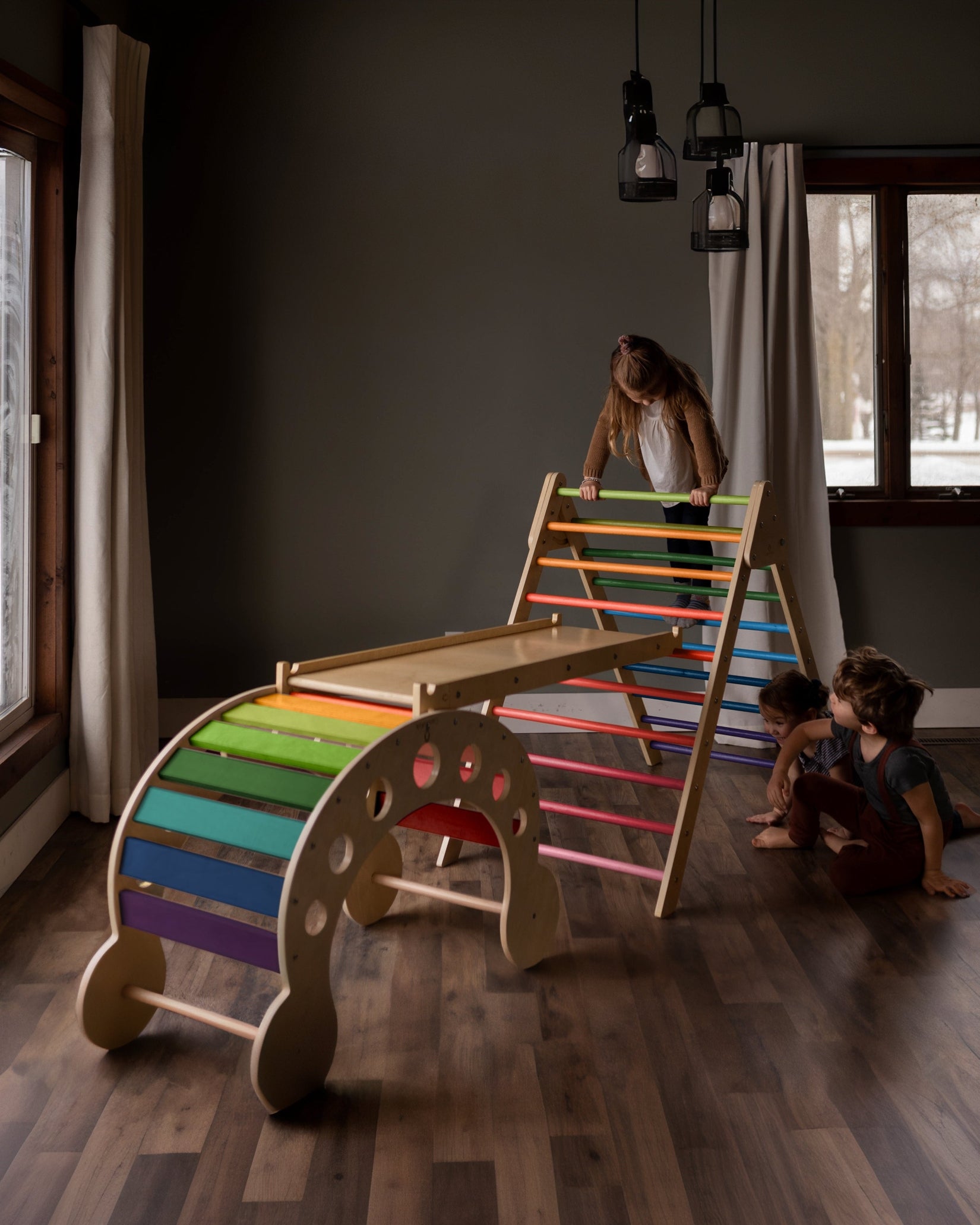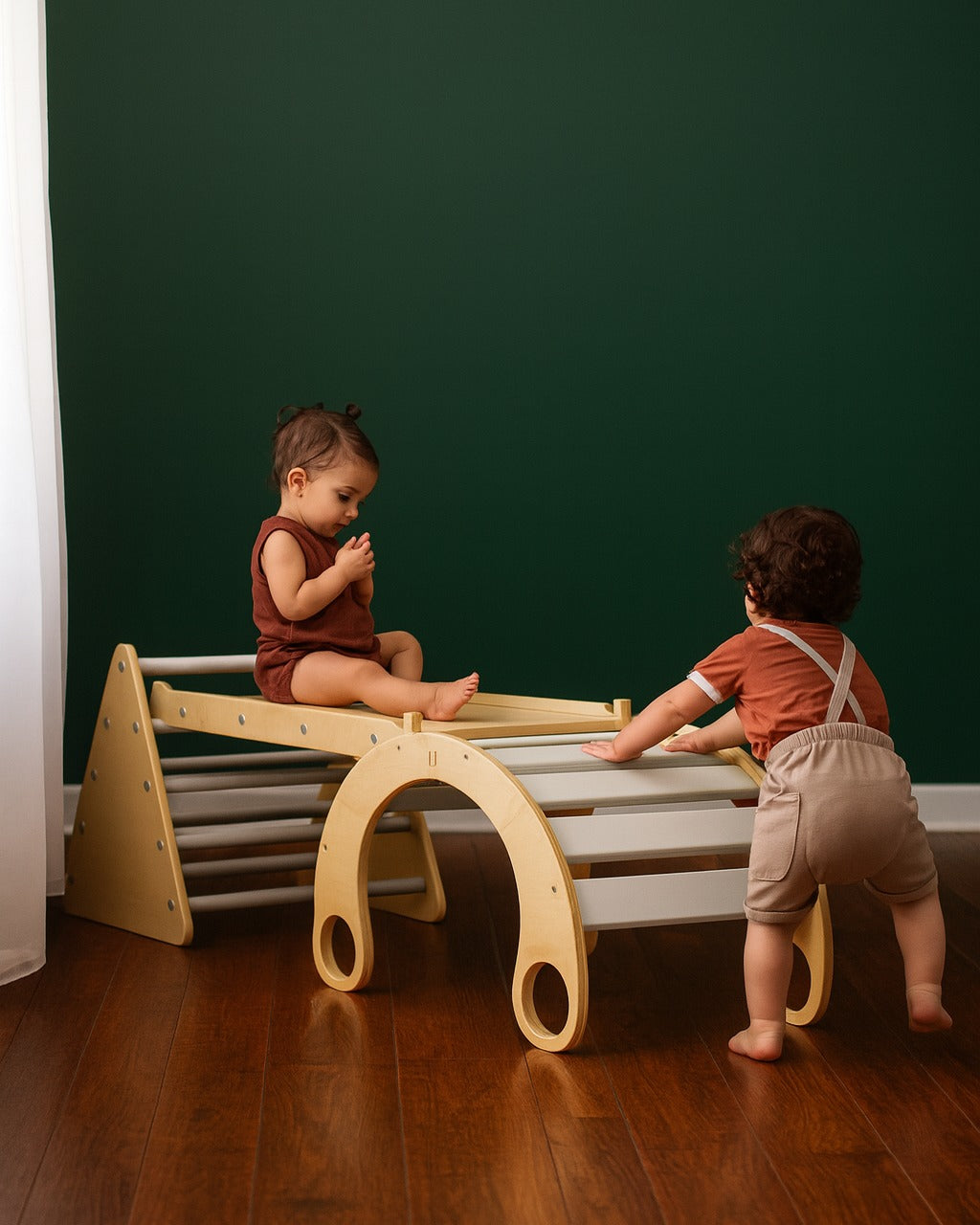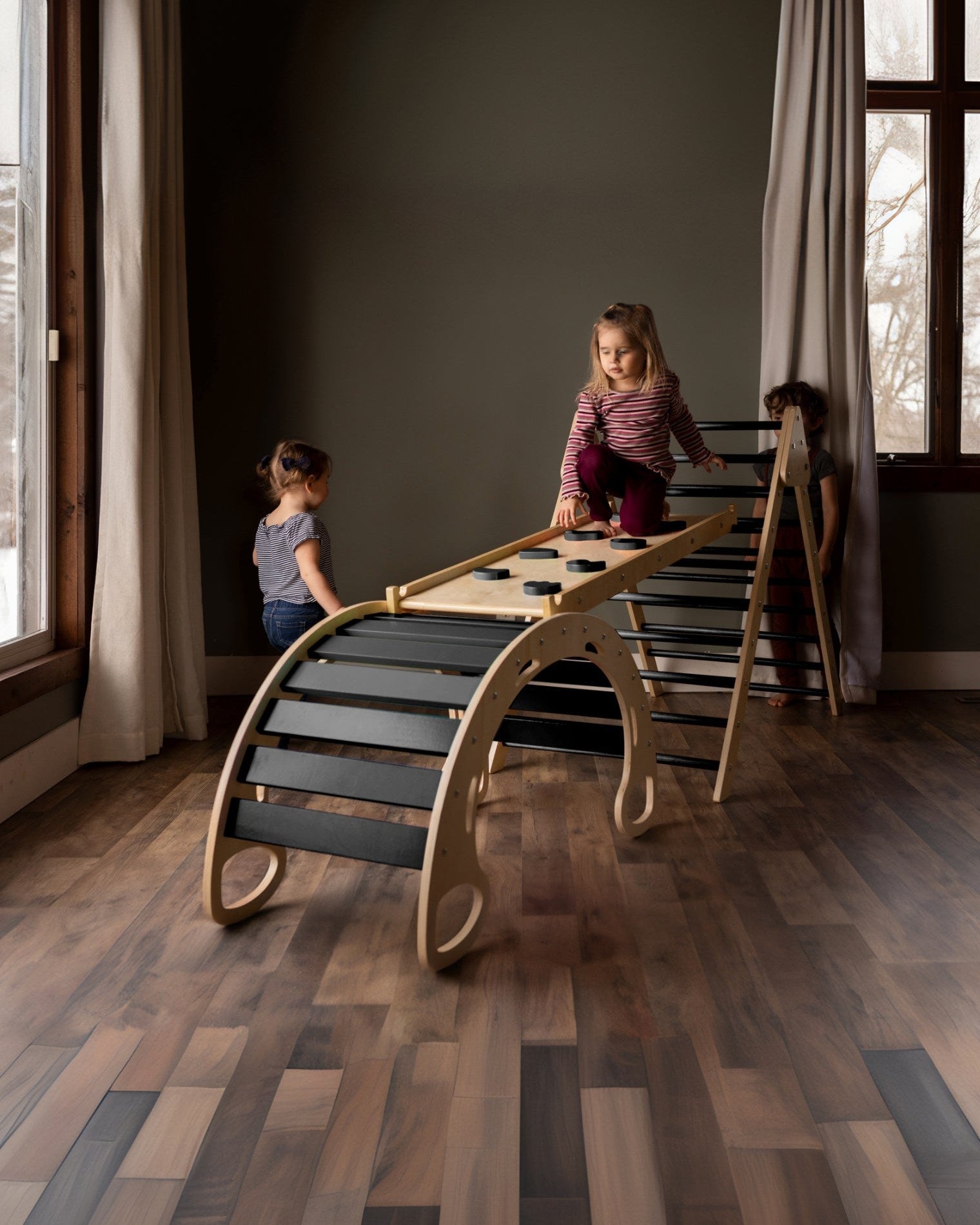 The Blue Ridge Waldorf Playset invites children to explore and develop gross motor skills, strength, and confidence through hands-on climbing experiences. Designed for children aged six months and older, it supports early milestones such as pulling up and grasping rungs, progressing to full climbs as strength and assurance build. With the addition of a blanket, this versatile playset transforms into a cozy tent or reading nook, offering a serene space for quiet moments and imaginative play.