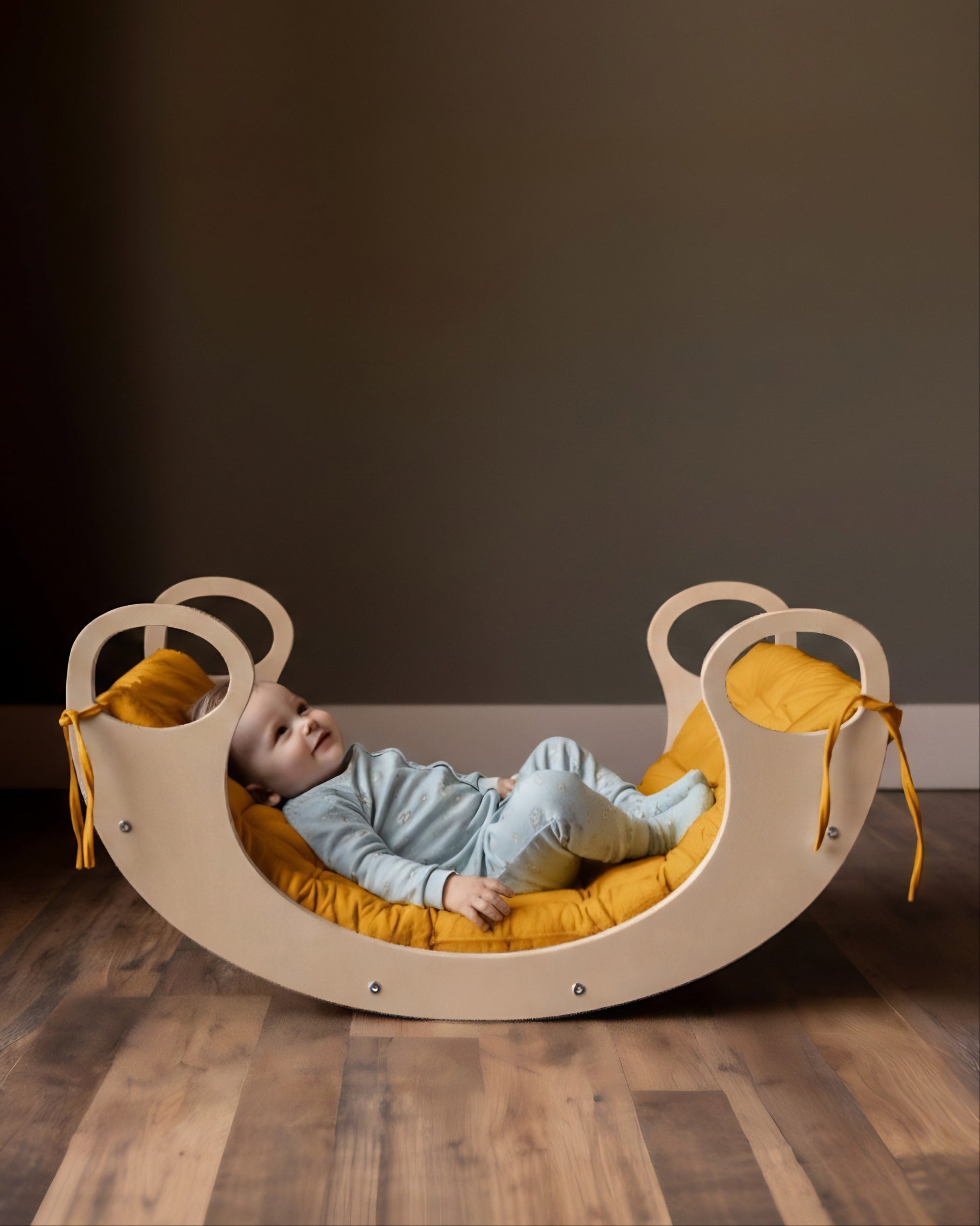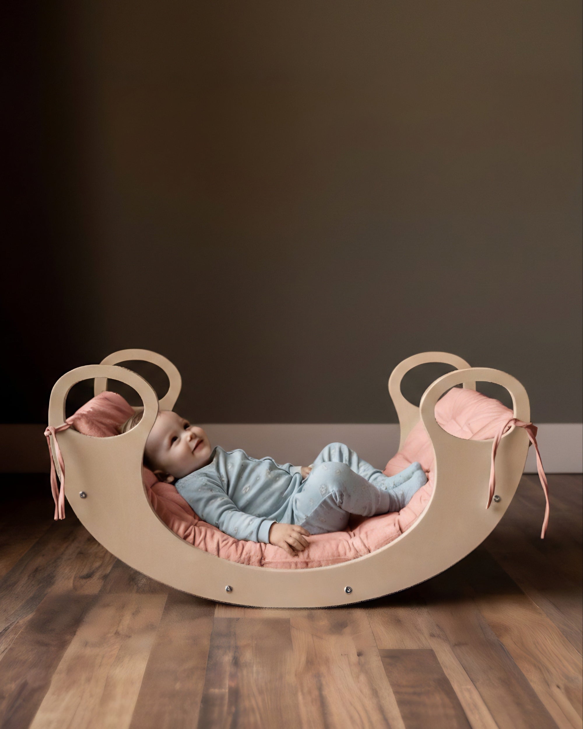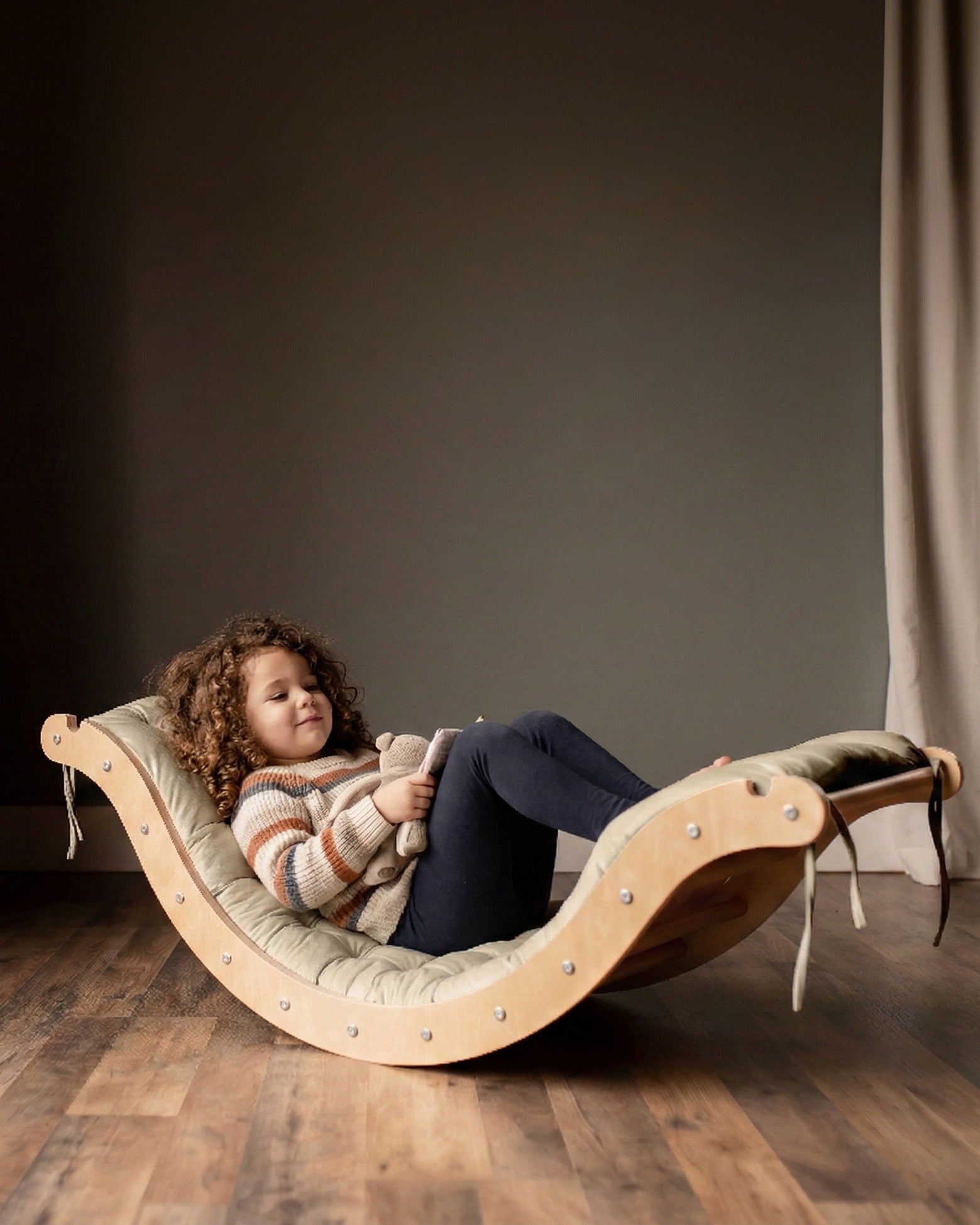 Designed specifically for toddlers, its gentle curve provides a soothing rhythmic motion that helps develop balance, coordination, and spatial awareness. The minimalist, ergonomic design fits seamlessly into any modern playroom or nursery, offering a timeless aesthetic that grows with your child.