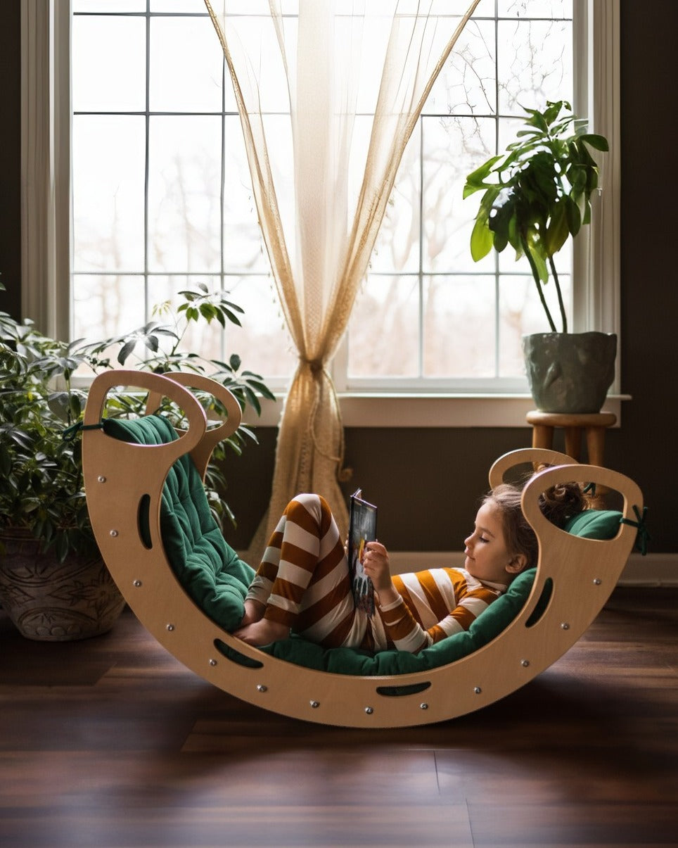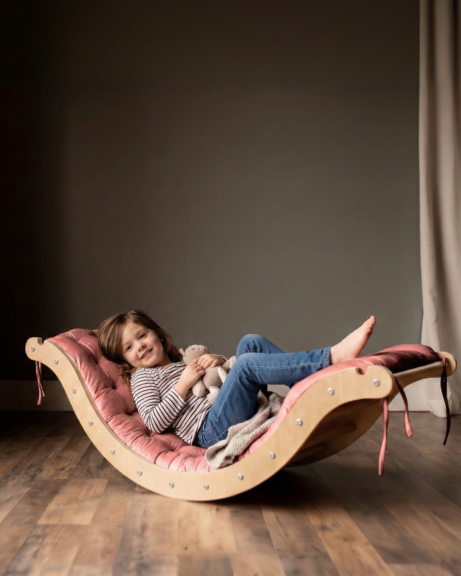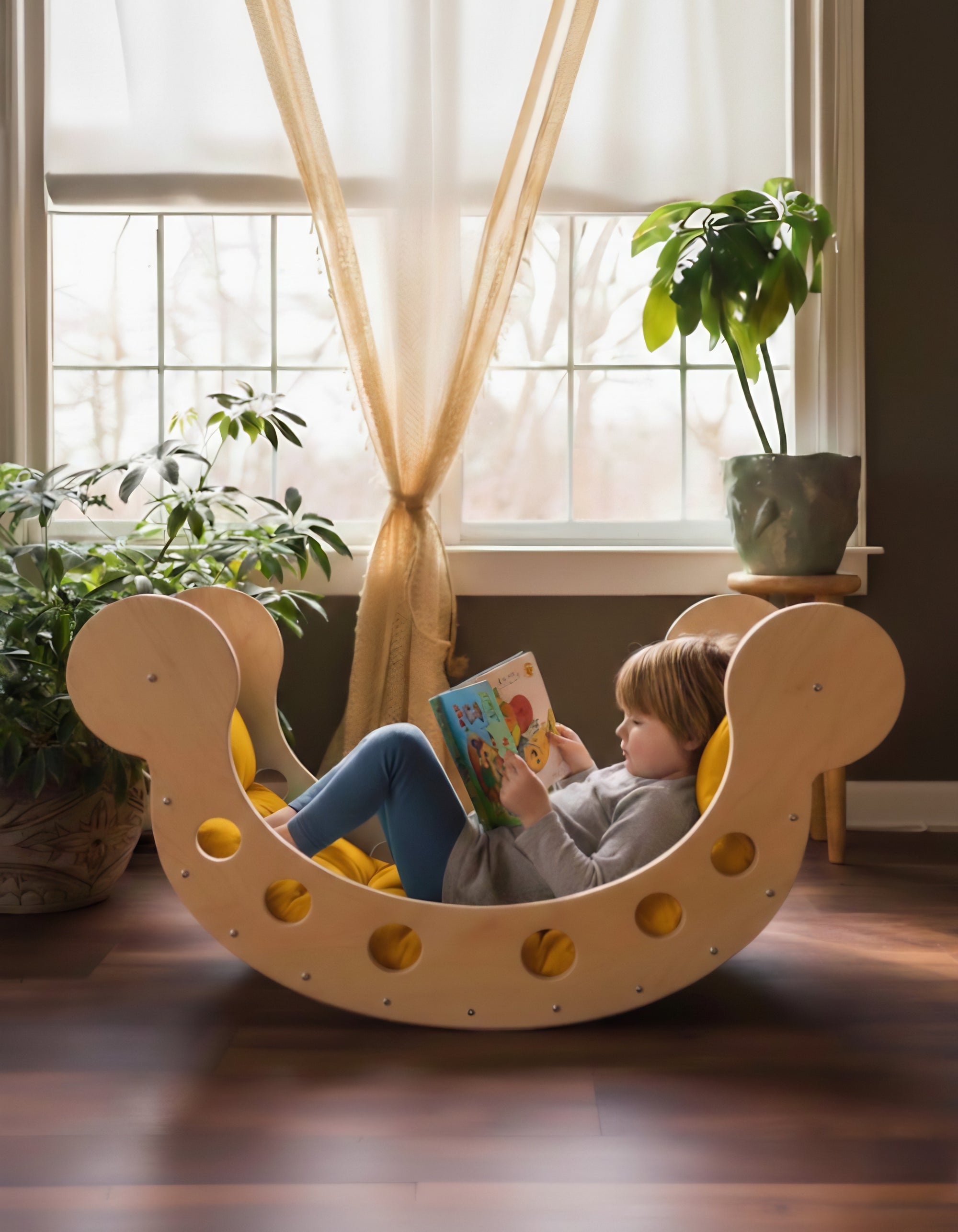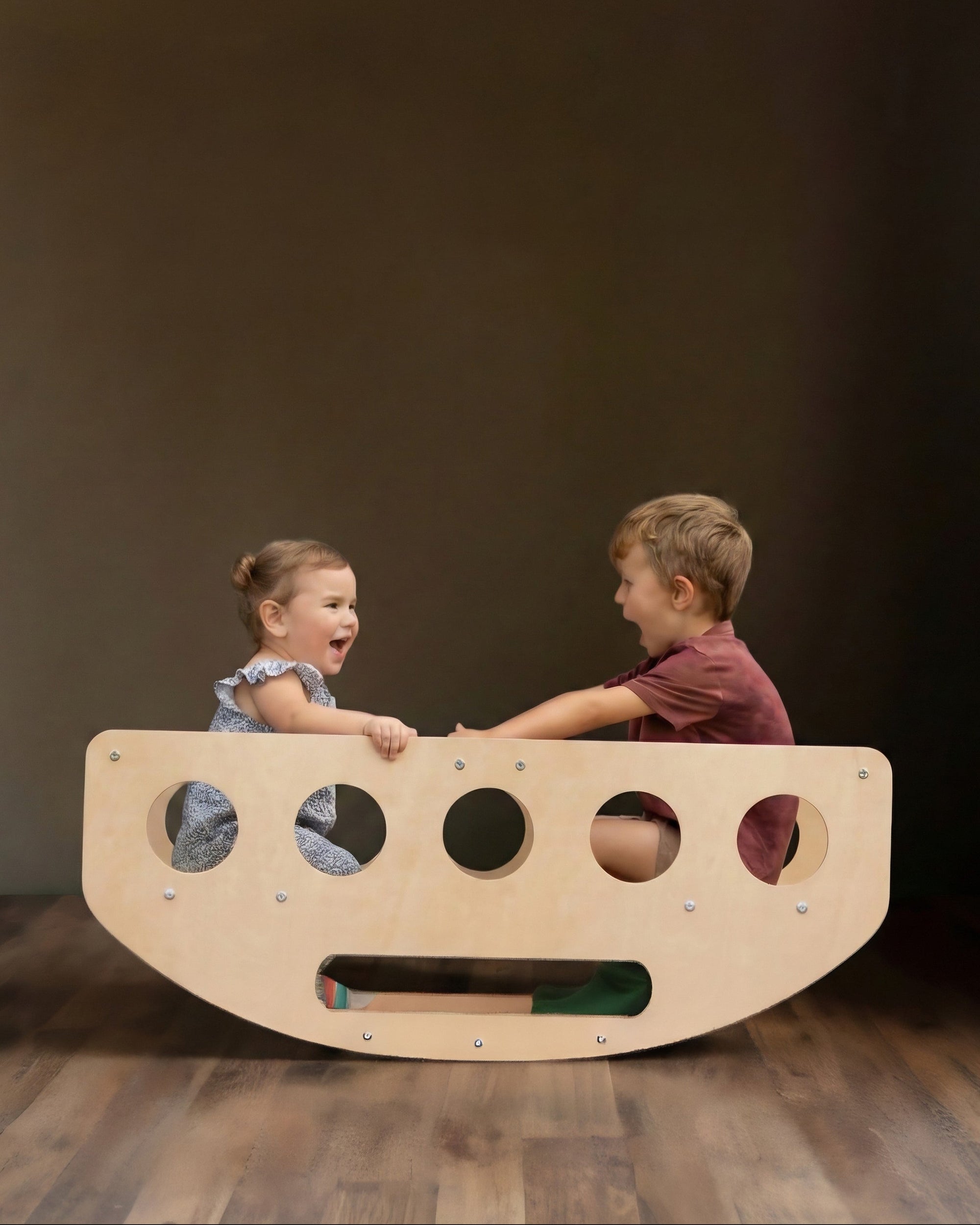 Designed specifically for toddlers, its gentle curve provides a soothing rhythmic motion that helps develop balance, coordination, and spatial awareness. The minimalist, ergonomic design fits seamlessly into any modern playroom or nursery, offering a timeless aesthetic that grows with your child.