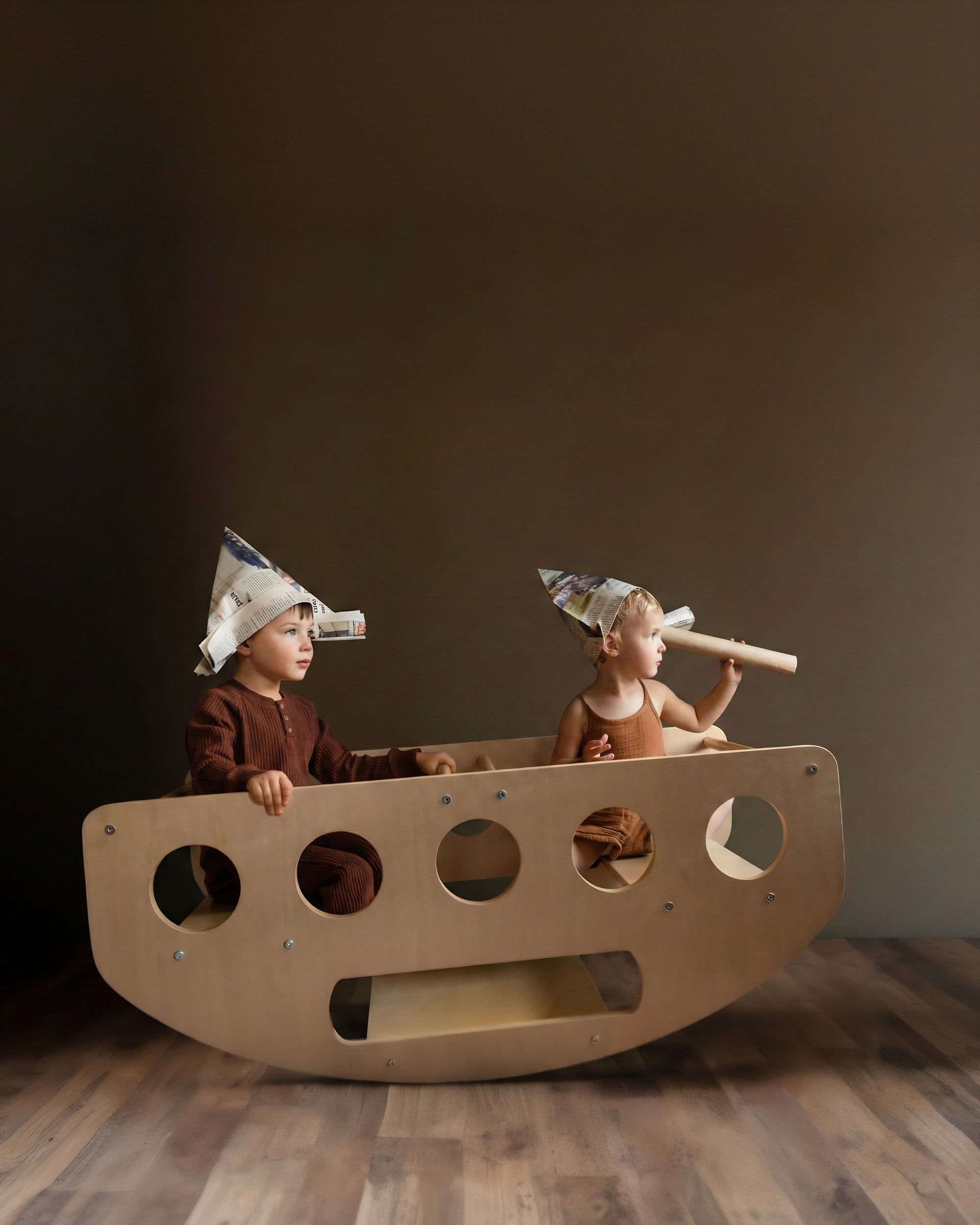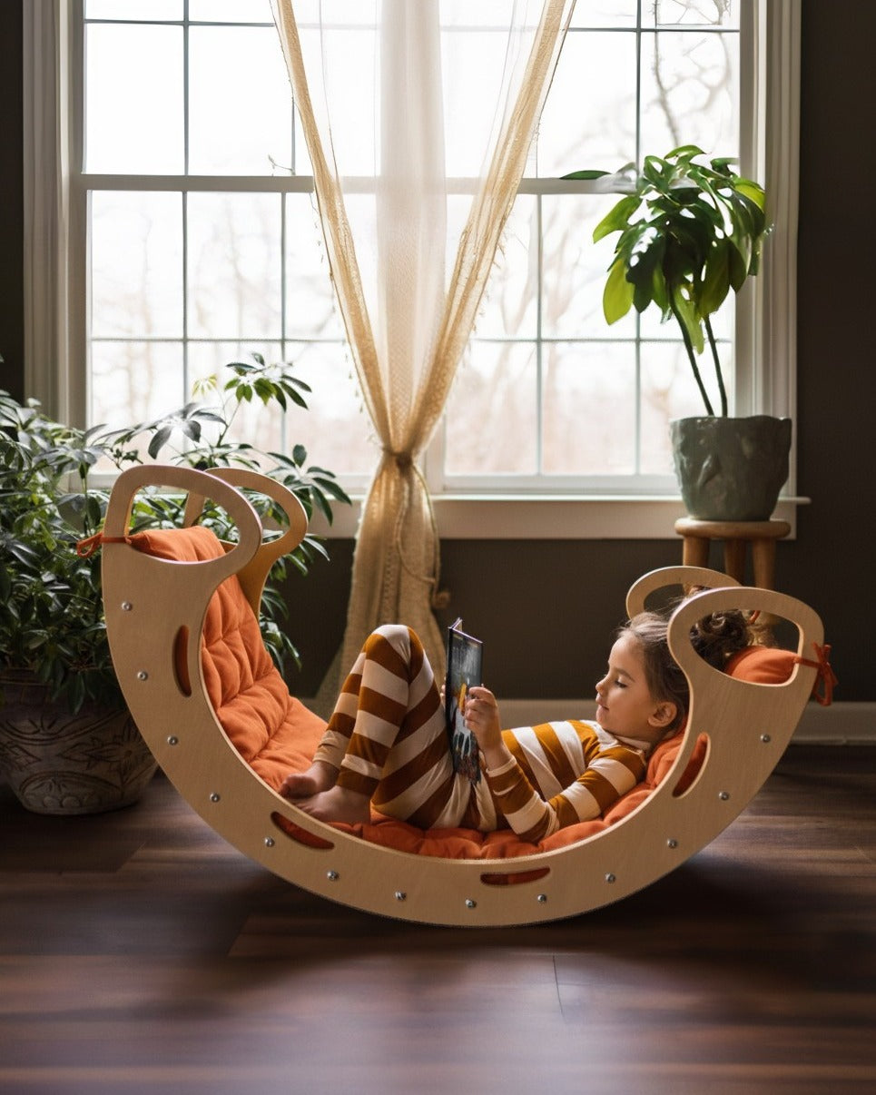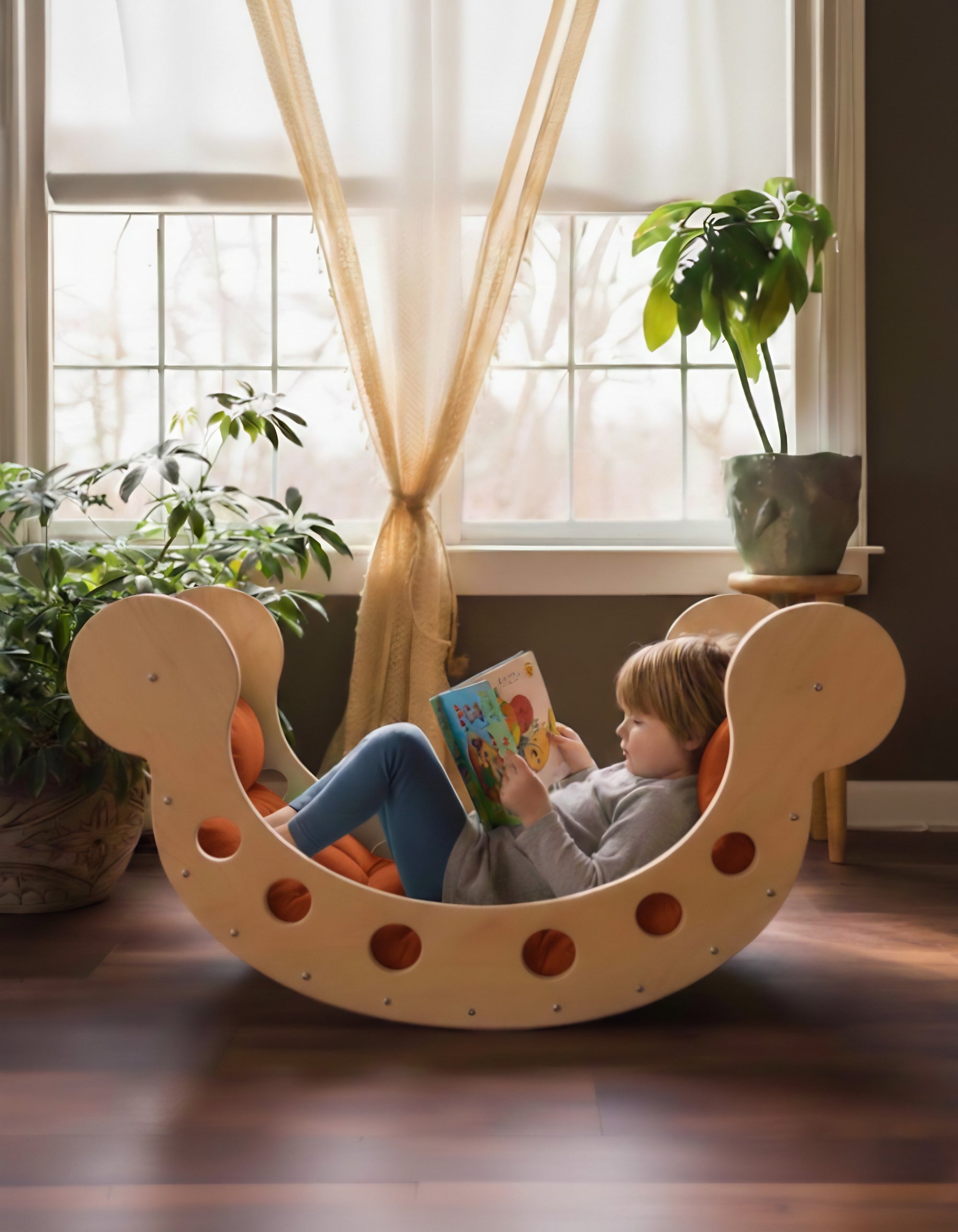 Fuel imagination and foster movement with the Small Waldorf Wooden Rocker. Inspired by open-ended play principles, this beautifully crafted rocker is more than just a seat—it’s a boat, a bridge, a tunnel, and a cozy reading nook all in one.